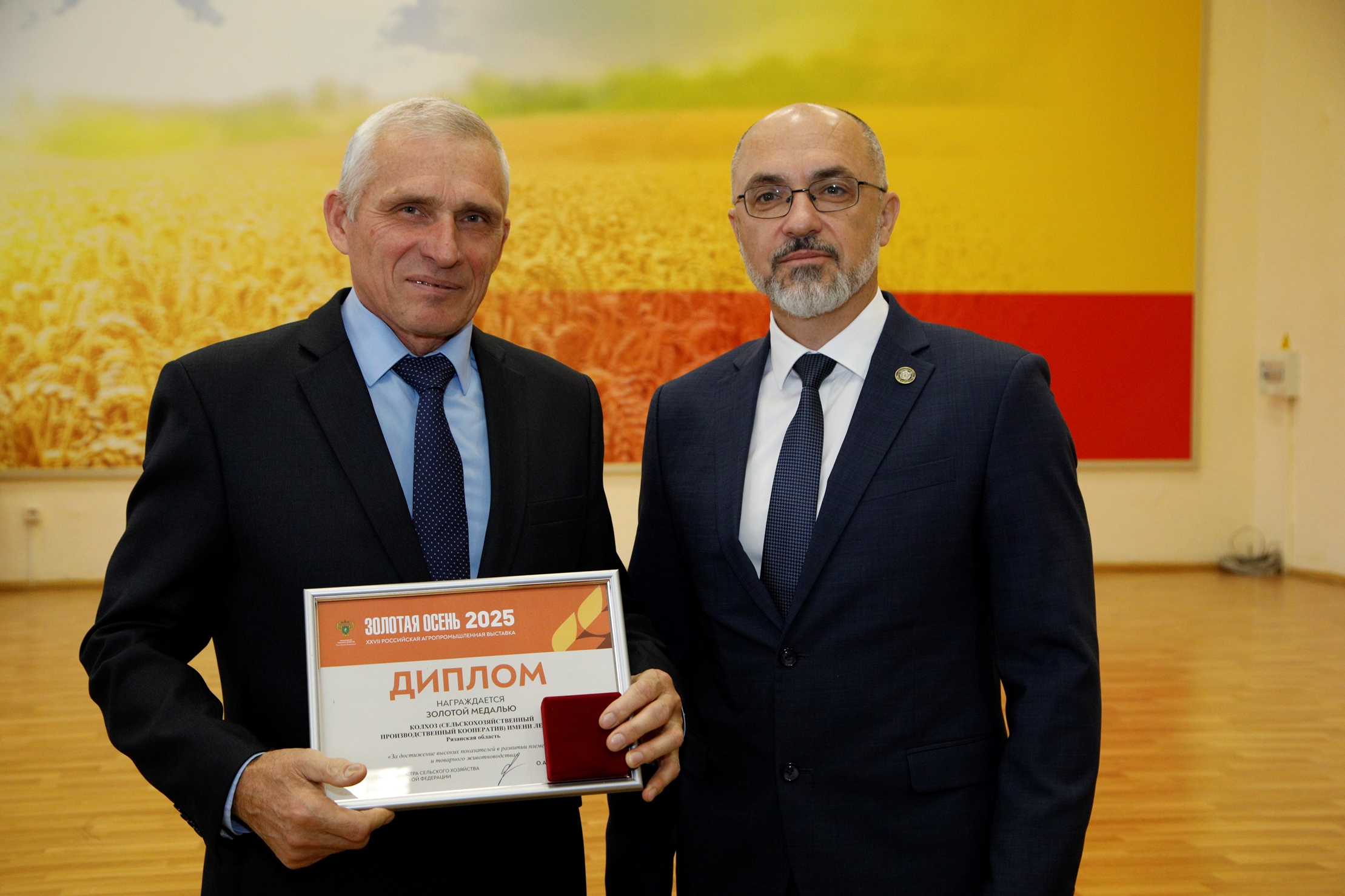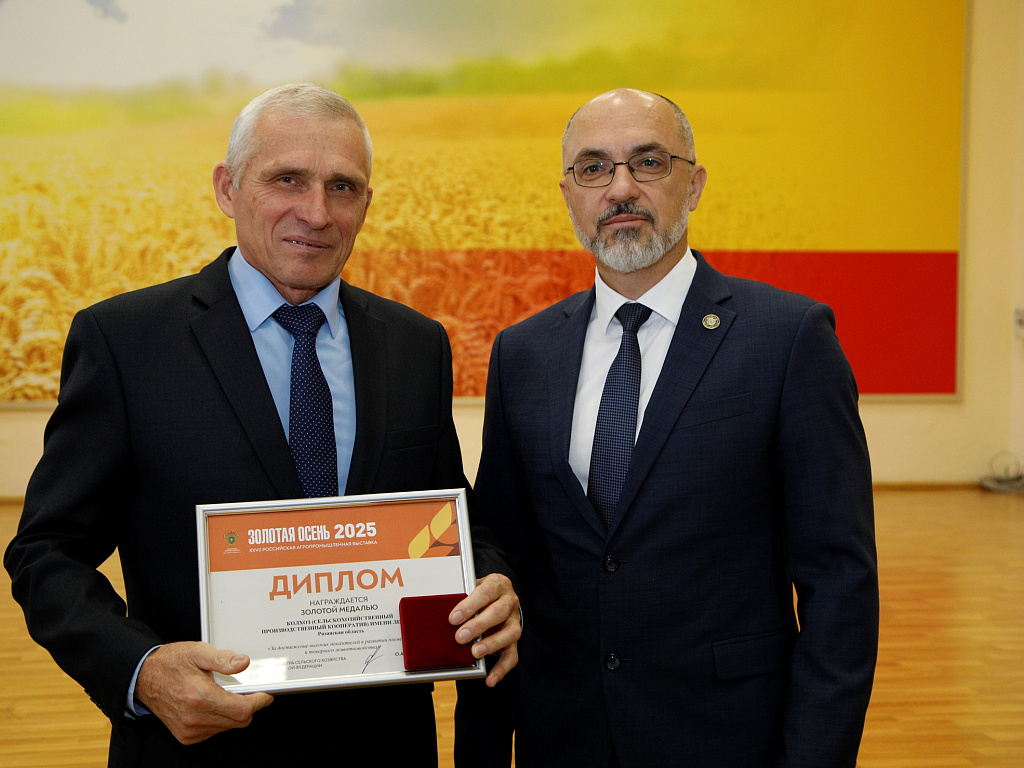 Итогом участия рязанских предприятий в Российской агропромышленной выставки «Золотая осень 2025», которая прошла 8–11 октября в Москве, стали 36 медалей, в том числе 26 – золотых, 8 серебряных и 2 бронзовых – эти награды сегодня передали коллективам предприятий.