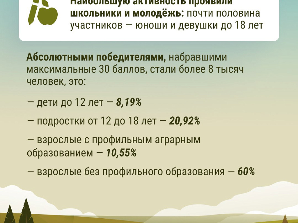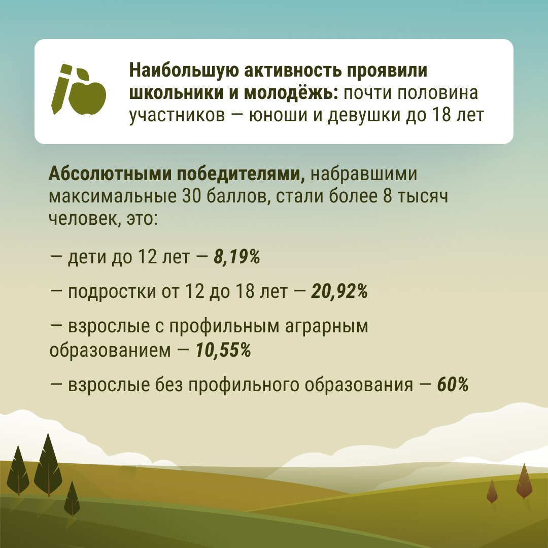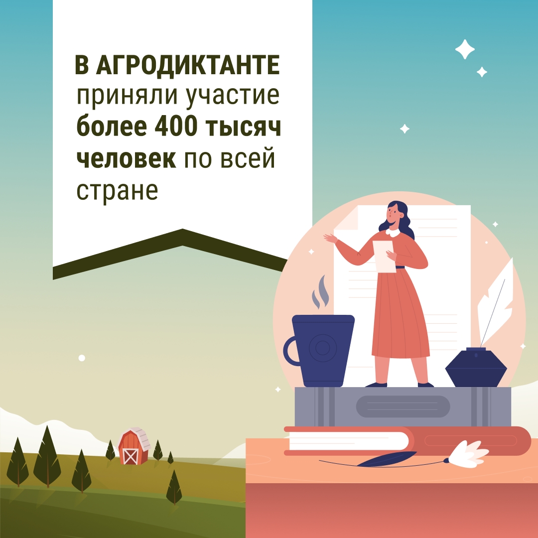 Подведены итоги первого Всероссийского аграрного диктанта. В нём приняли участие более 400 тысяч человек – сотрудники сельхозпредприятий, руководители и специалисты профильных министерств, преподаватели и студенты университетов и колледжей, школьники и активные граждане.
